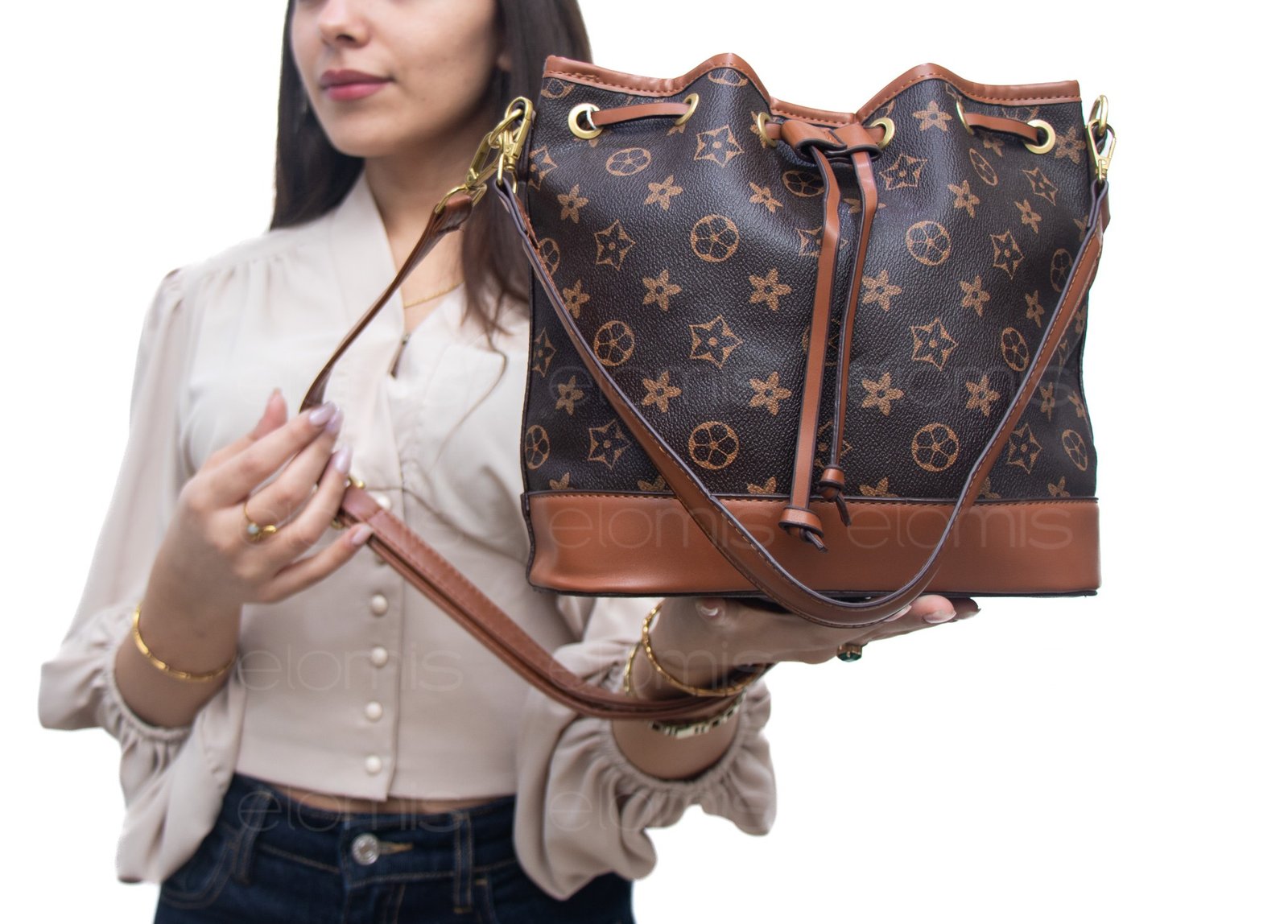Petit sac bandoulière en tissus avec fermoir en cuir synthétique marron – Beige nuancé / taupe